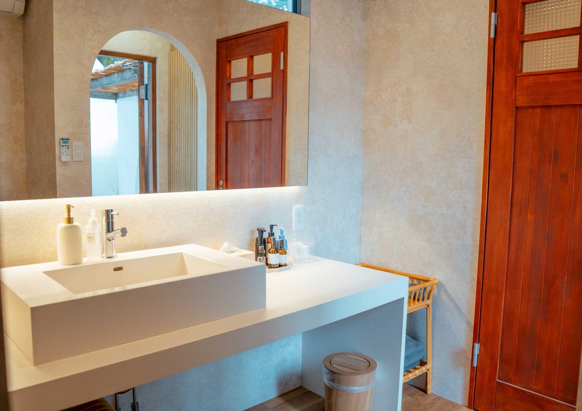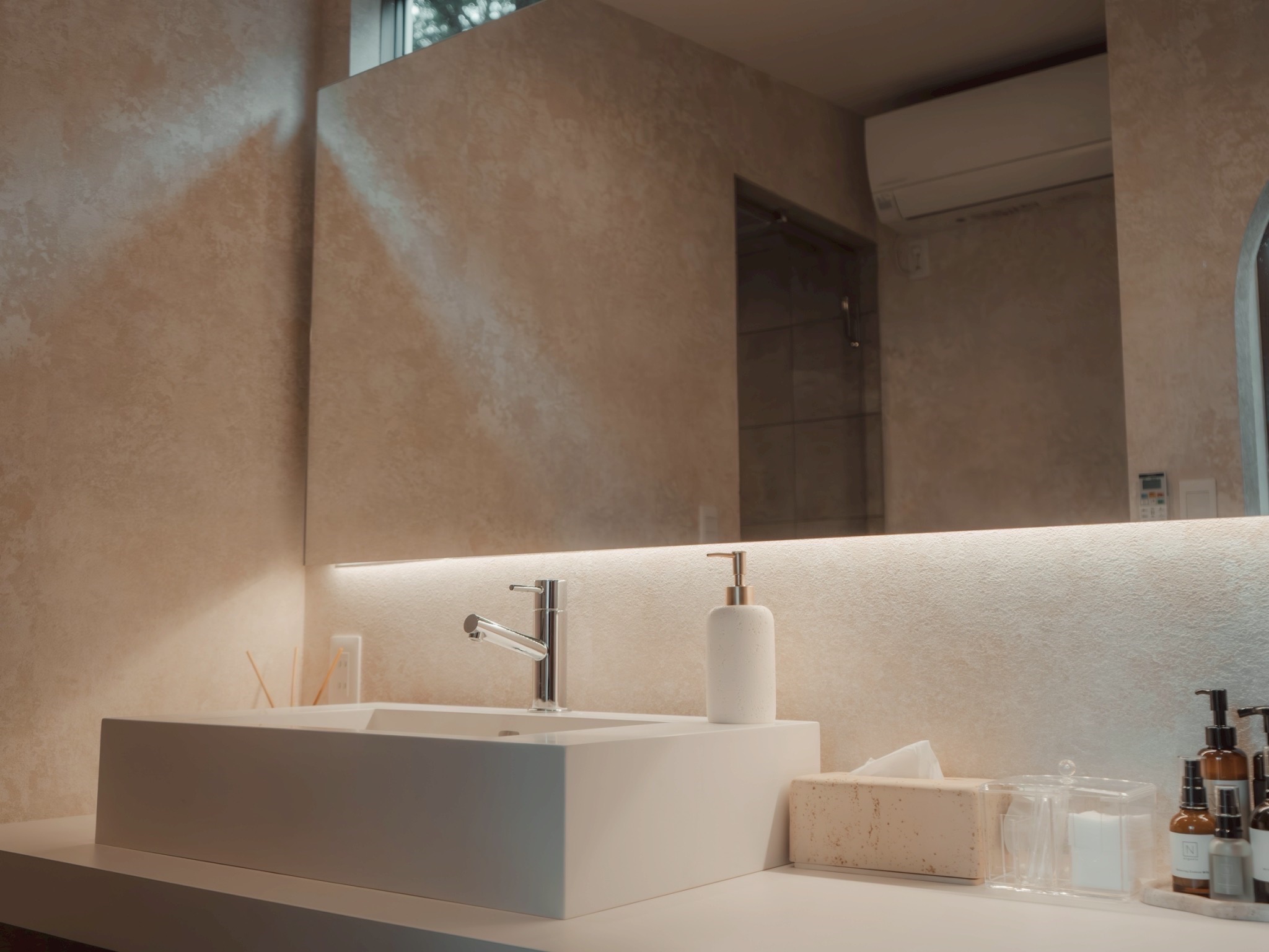 独立トイレや広々とした洗面カウンター、シャワー完備のバスルームを備え、アウトドアながらも上質で快適に過ごせる環境を実現しています。